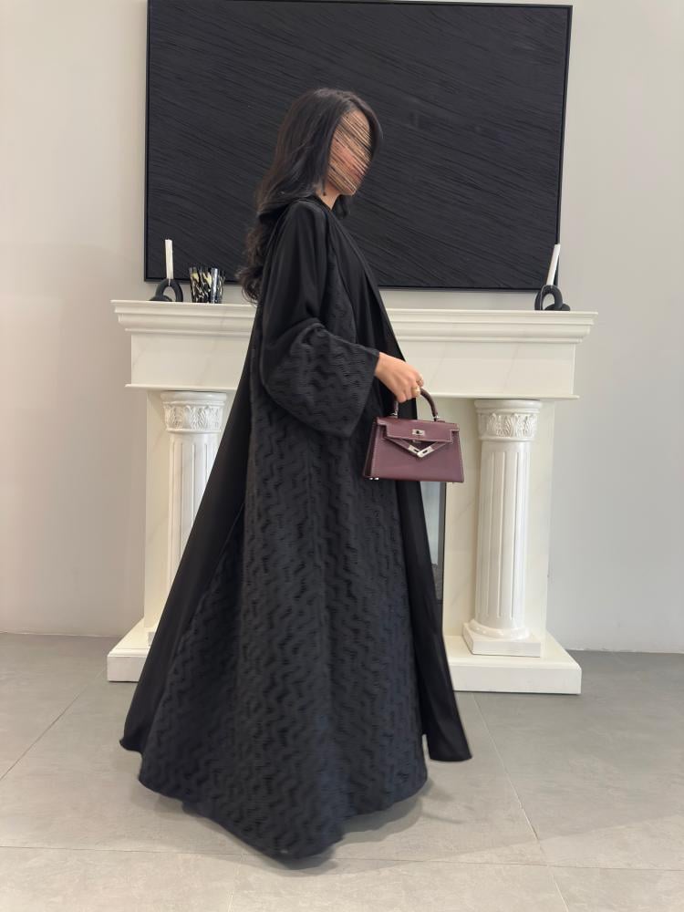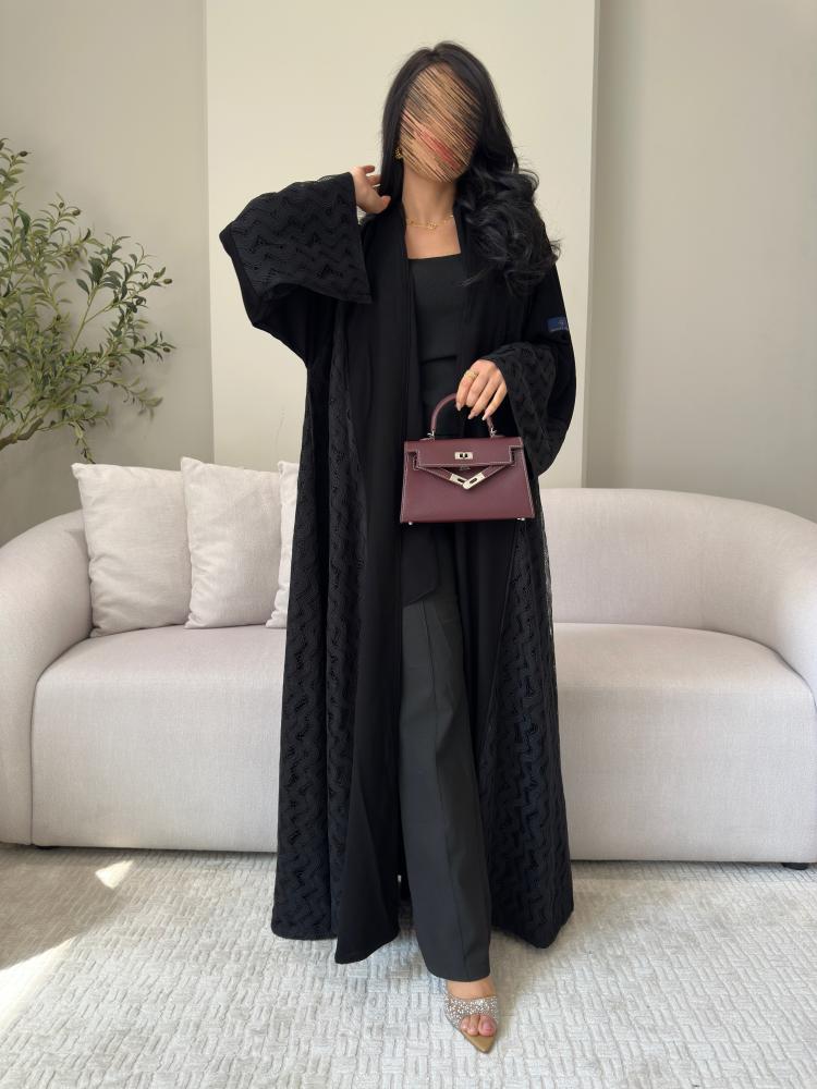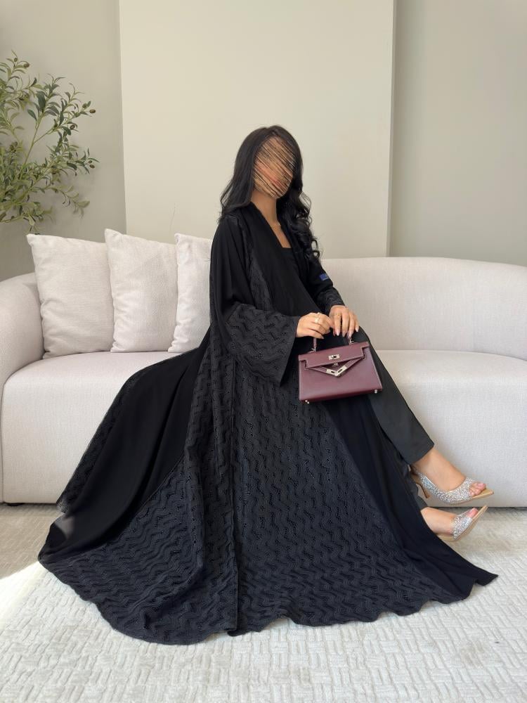 عباية سوداء أنيقة بقصة الكلوش بقماش الكريب الملكي مزينة بدانتيل شبك مموج على الجانبين و اطراف الكم ، يمنحها لمسة فاخرة