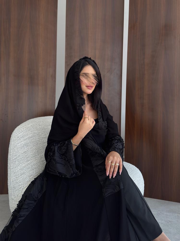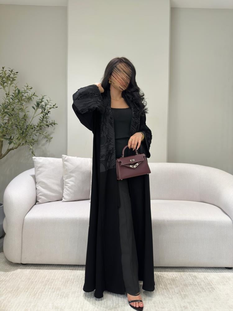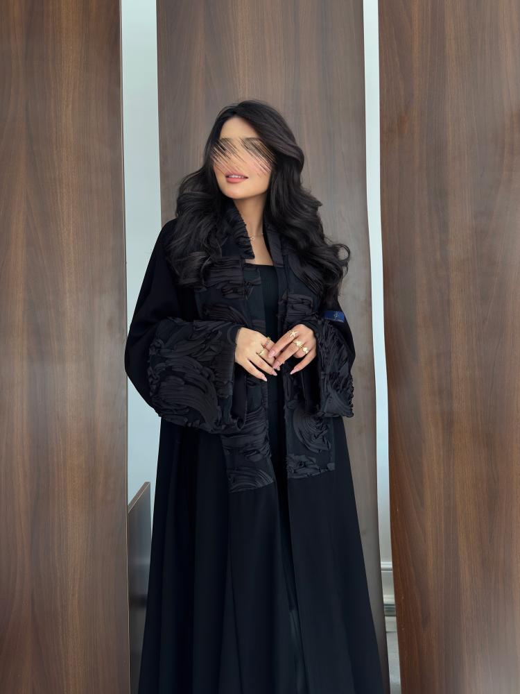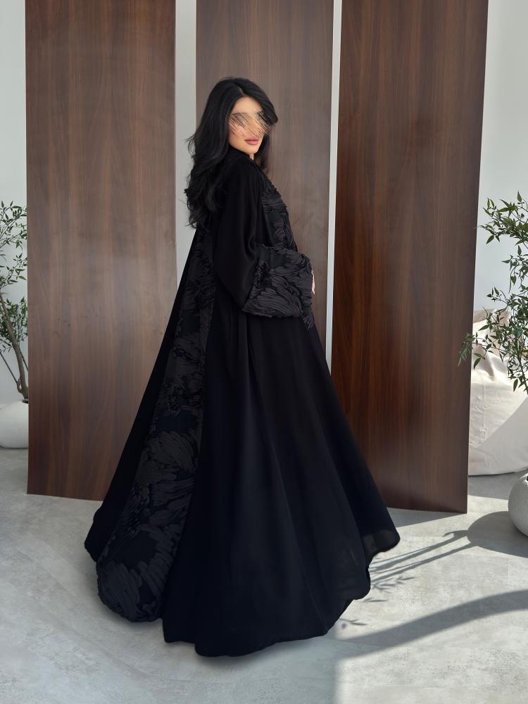 عباية سوداء فاخرة بقصة نص كلوش تنسدل بأناقة مزينة من الخلف وأطراف الأكمام بقماش مشغول فاخر مع تفصيل راقٍ عند الياقة الأمامية بنفس القماش يبرز جمال التصميم ويكمل إطلالة مميزة وناعمة