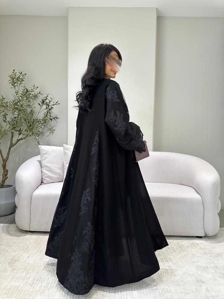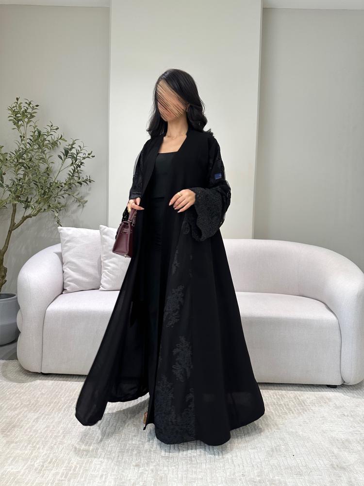 عباية كلاسيكية راقية بقماش الكريب الملكي بقصة الكلوش تتمثل بكسرات مثلثه من الدانتيل يضيف لمسة هندسية أنثوية